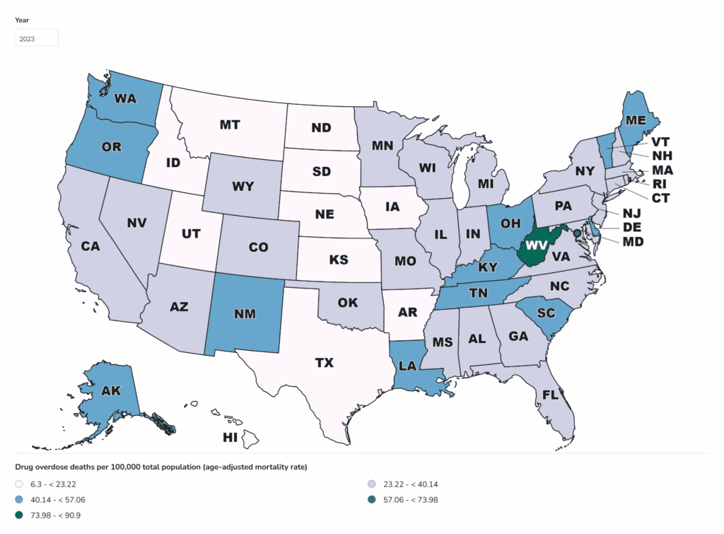 Drug overdose deaths have been rising all across the country. Coastal states and those in the Appalachian Mountains have been hit the hardest. Deadly drugs are especially prevalent in West Virginia, which suffered 81.9 deaths per 100,000 residents.